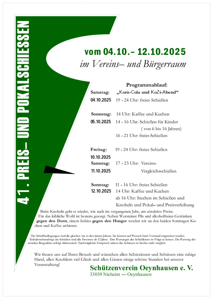 In der Zeit vom 04.10. — 12.10.2025 ver­an­stal­tet der Schüt­zen­ver­ein sein tra­di­tio­nel­les Preis- und Pokal­schie­ßen. Der genaue Ablauf kann dem Pla­kat  ent­nom­men wer­den.  Wir freuen
